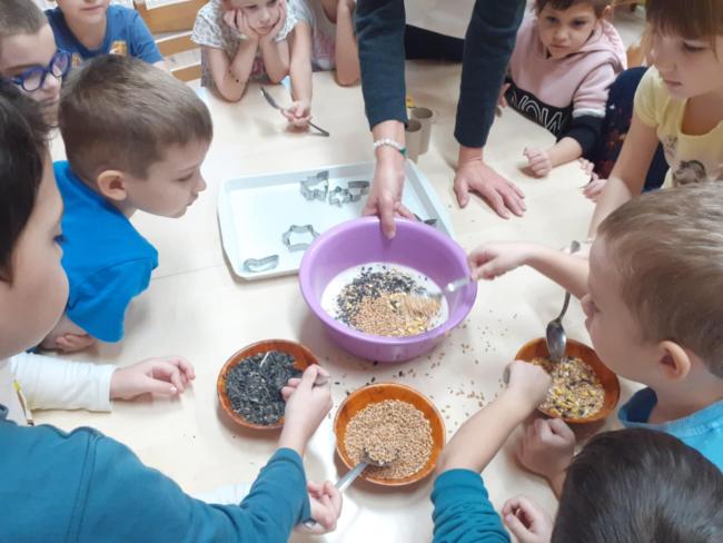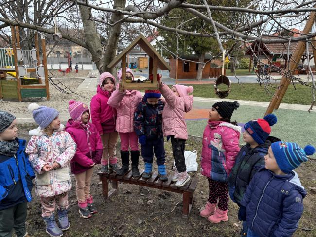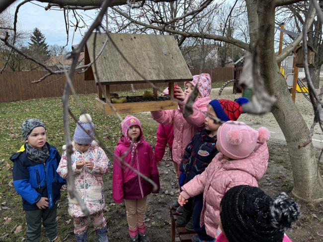 A tél beköszöntével naponta feltöltjük az óvodánk udvarára kihelyezett madáretetőket.